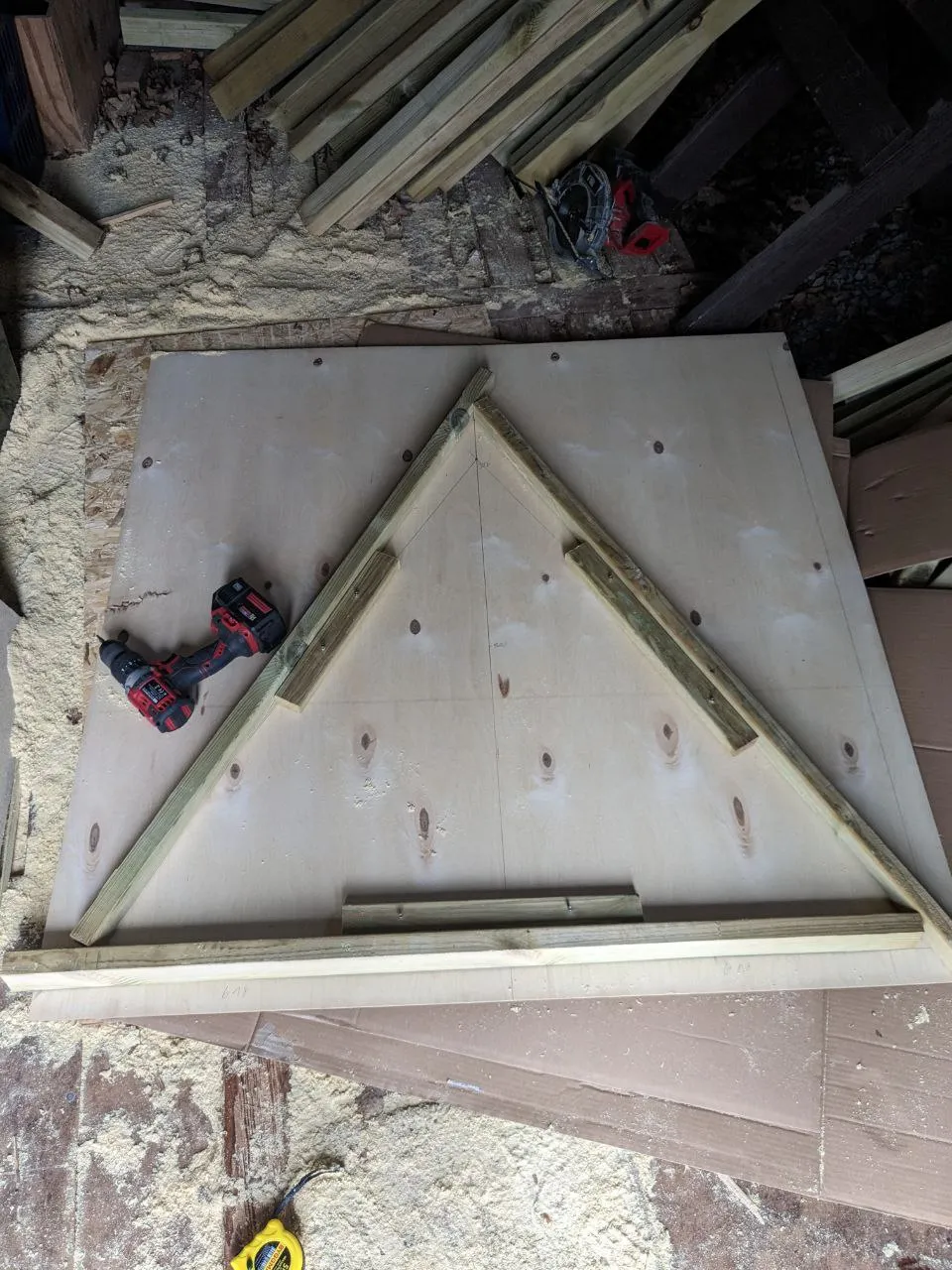 Once the assembly was done, I moved the individual triangles to a nearby pond to screw them together.